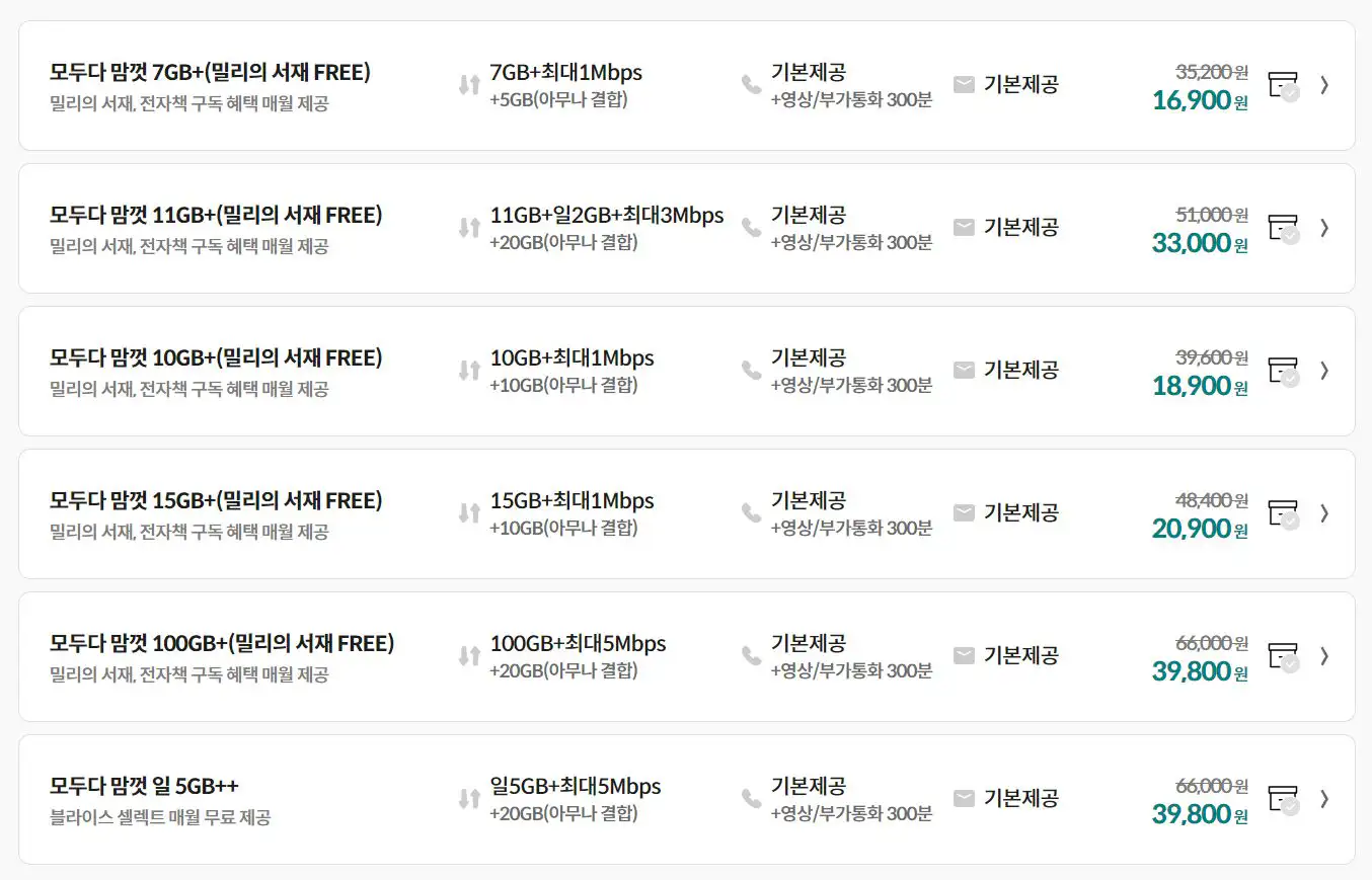 가장 저렴한 요금으로 데이터, 통화를 무제한으로 이용하는 모두 다 맘껏 7GB+입니다. 16,900원이며 데이터는 7GB가 제공됩니다. 혜택으로 제공되는 밀리의 서재 서비스만 해도 9,900원 상당이기 때문에 매우 저렴하다 할 수 있습니다.